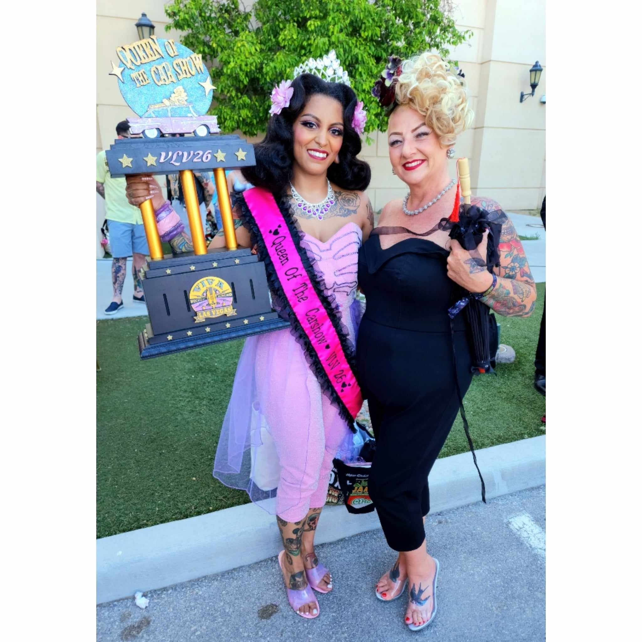 A custom pink playsuit with rhinestoned skeleton for Brittany Calavera, VLV26 Queen Of the Carshow