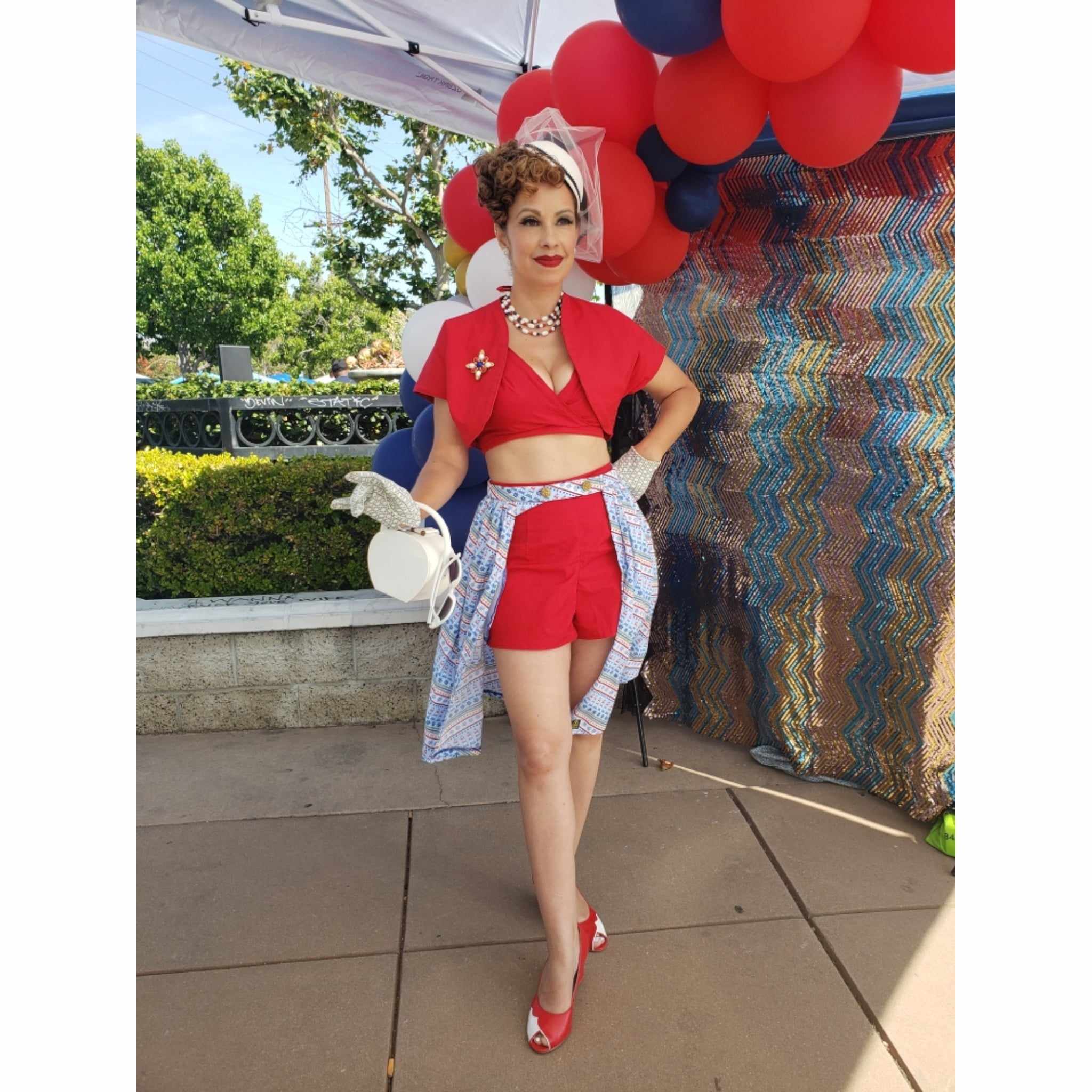 Styled with vintage accessories. A custom shorts, bra top, bolero and overlay for Miss Mami Jolly