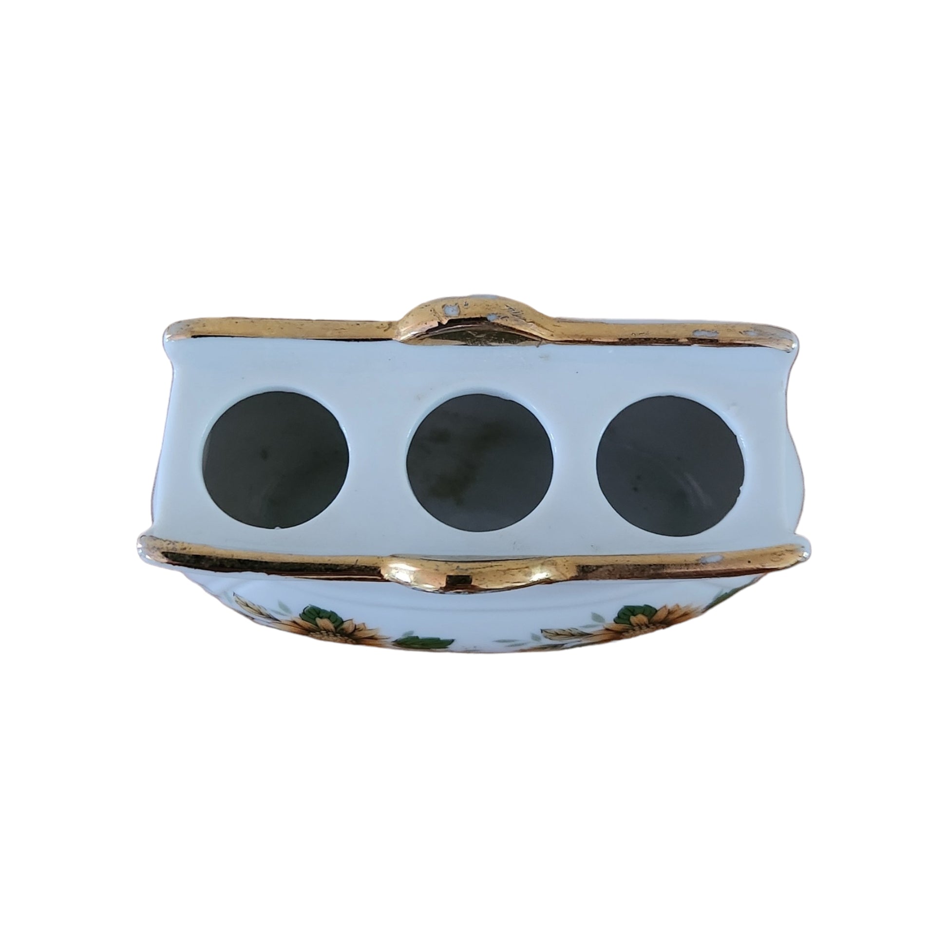 This ceramic lipstick holder features a charming sunflower design on both sides and can hold up to 3 tubes of lipstick. While the gold trim at the top may show some signs of vintage wear, there are no cracks, chips, or repairs, leaving the holder in overall great condition. It measures 1.5" wide, 4" long at its longest point, and has a depth of 2".